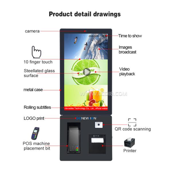 This kind of interactive payment machine is very popular in retails shops, chanin stores and restaurants, people can order food or commodity by themselves, and get receipt automatically after paying. Support various payment method like QR code, bank card. Also cash receiver is also on option. Thermal printer can be with USB port or RS323 Lan port.